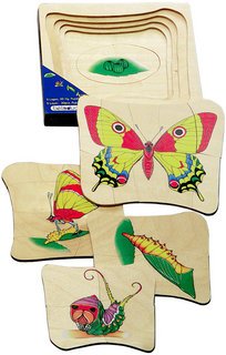 Enhance a child's understanding of the natural world, and you can really say you've done something. Layer by layer, children explore biology, insect growth & metamorphosis with a unique wooden puzzle. Building each level, piece by piece, kids start to get the big picture life cycles are integral to every living thing. Each new stage is beautiful and valuable. Puzzle layers include: Egg Caterpillar Chrysalis (cocoon) Emerging butterfly Brilliant adult butterfly! 30 wonderful Birch wood pieces make up 5 distinct jigsaw puzzle layers. The insect puzzles illustrations are just the right combination for a children's puzzle - both realistic and simple. Each layer is its own individual wooden puzzle. Children can lay each picture puzzle side by side to view progression of growth or build layers on top of one another for sequencing the replacement of one stage of growth with another. Puzzles aid in children's growing visual development, mental processing skills, and fine motor skills. Science puzzles like this one encourage understanding and care for our natural world. Hape layer puzzles are layer upon layer of beauty! Wonderful colors and smooth wood make this child's puzzle an heirloom toy. Influence generations with an appreciation for nature's wonders. Hape 5 Layer Puzzle Butterfly Life cycle puzzle for young children Insect puzzle: Butterfly growth & development 30 puzzle pieces with puzzle frame; 5 picture puzzle layers Stages: Egg, Caterpillar, Chrysalis (cocoon), Emerging butterfly, Adult butterfly Vivid colors, solid construction; Heirloom wooden puzzle Science puzzle made of natural birch wood Conforms to European & North American Safety Standards Dimensions: 8 x 8 x 1 inches Ages 4+